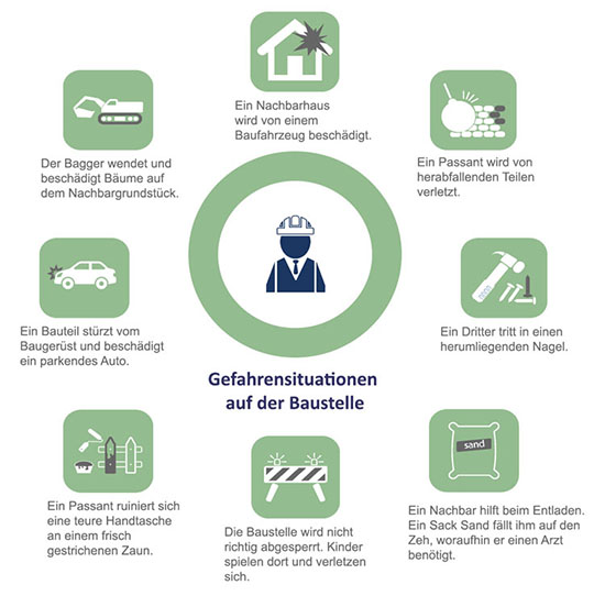 Mal angenommen, Sie haben eine Baufirma mit den Bauarbeiten beauftragt. Mitten in der Bauphase rutscht ein Passant auf liegen gebliebenem Bauschutt aus, den die Baufirma noch nicht beseitigt hat. Dabei bricht sich der Unglücksrabe das Steißbein, muss ins Krankenhaus und kann eine Weile seiner Arbeit nicht nachkommen. An wen trägt der Passant seine Schadensersatzansprüche heran? An Sie als Bauherren. Sie haften in unbegrenzter Höhe mit Ihrem Privatvermögen für entstandene Schäden. Das können bei schwerwiegenden Unfallverletzungen mehrere hunderttausend Euro Schmerzensgeld und Ausgleichszahlungen sein.